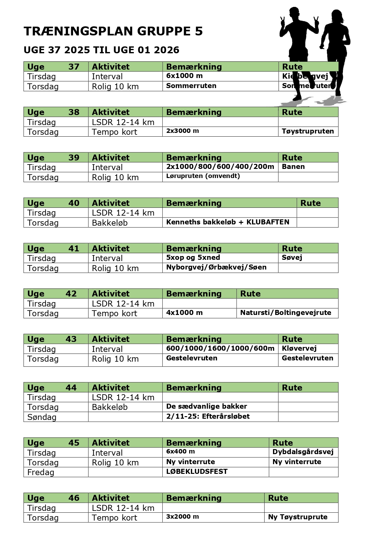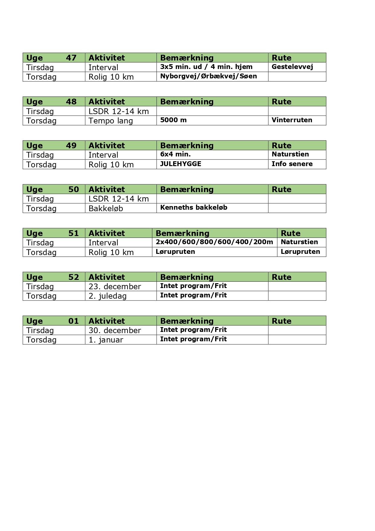 Træningsplan gruppe 5 Nyborgvej- Ørbækvej- Søen Natursti – Boltingevej Gestelev 10 km. Ny Tøystrup 3×2000 m. tempo Lørupruten – 10 km Hestehaveskoven – 10 km Sommerruten Tøystrupruten Sdr. Højrup ruten – 12 km Pederstrup ruten Vinterruten Ny vinterrute